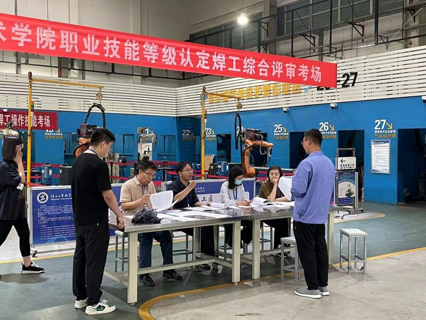 第一批职业技能等级认定涉及工种、级别多,包括本校教师和社会人员,由继续教育与培训学院组织理论考试,电气工程学院、机械工程学院、材料工程学院、财经与旅游学院组织实操认定。为确保本次认定工作操作规范,从考场布置、实操安排、考评员配备、试题管理、考务过程管理等方面按照咸阳市人力资源和社会保障局相关要求实施。咸阳市人力资源和社会保障局副局长吕阿妮、职业能力建设科科长边磊、劳动技能鉴定服务中心主任李涛等一行7人对本次职业技能认定工作进行了全程的督导检查。特别是对焊工技师、高级技师的综合答辩环节进行深入的指导。同时,继续教育与培训学院院长闫军、技能管理科科长商序对各环节进行了全面的监督检查。