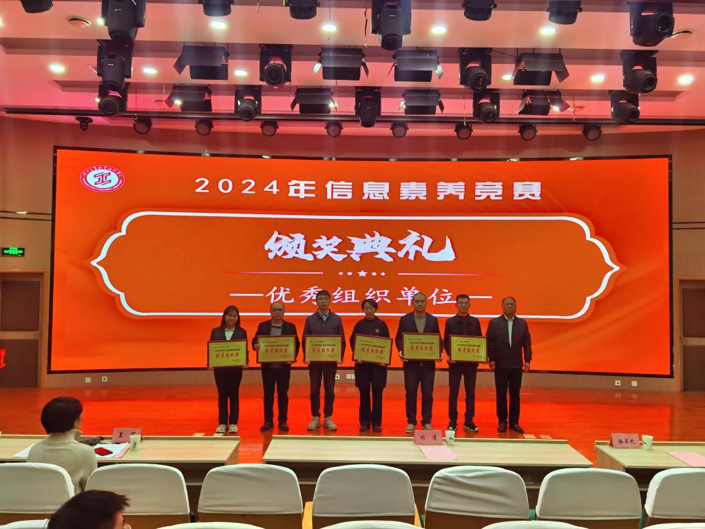 随后,图书馆馆长王丁宣读了《关于表彰2024年信息素养大赛获奖单位及个人的通知》。副校长刘清、图书馆馆长王丁、教务处副处长徐军纪、学生处副处长耿丽、信息化建设中心技术保障科科长郇林分别为2024年信息素养竞赛优秀组织单位、2024年信息素养竞赛获奖师生代表颁发奖牌和荣誉证书。