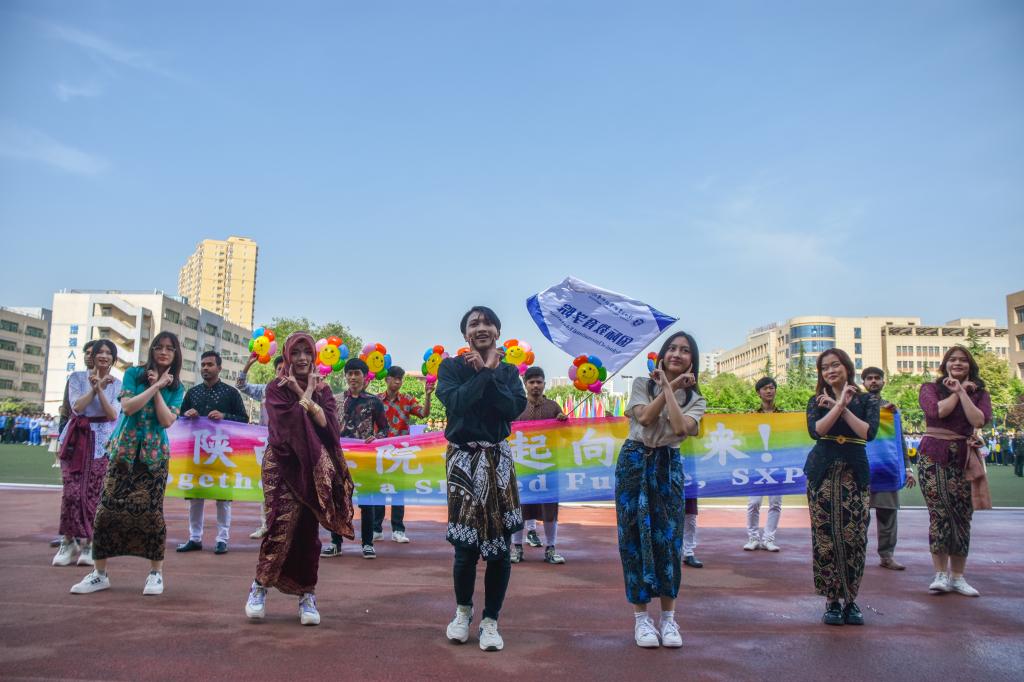 开幕式当天,留学生身着本国传统服饰,以饱满的精神与稳健的步伐步入主席台前。他们高举着带国际教育学院旗子,手拉五彩横幅“陕西工院一起向未来! Together for a Shared Future, SXPI!”,拿着笑脸气球高喊“我们爱你,陕工院!”。留学生以灿烂的笑容诉说着成为中外友好使者的追求与梦想,在主席台前演绎了印度尼西亚传统舞蹈,赢得现场掌声阵阵。