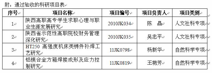近日,根据陕西省职业技术教育学会《关于教育科研规划课题准予结题的通知》(陕职学【2013】13号),我院4项研究课题顺利通过教育科研规划课题结题验收。